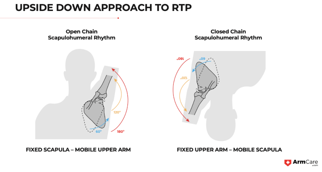 There are two types of actions for the upper and lower extremities. An open chain means that the segment is freely moving around in space. Throwing a baseball is an open-chain movement for the arm. Closed chain is when there’s ground contact, like a push-up, but in the case of Stan, in one session, we took him where he could tolerate by tricking his neuromuscular system into an improved scapulohumeral rhythm.