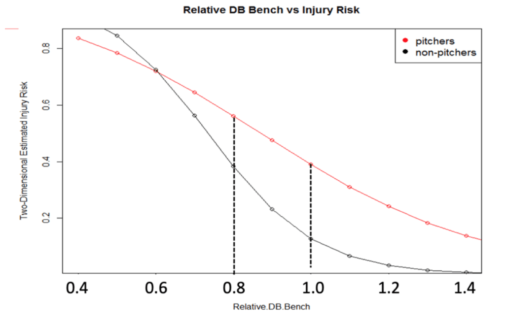 For most of my life, I trained the anterior upper body for the chest with bench pressing, laying the trunk horizontal. As I studied pitchers intently in the weight room, I found that when players can achieve 80% of their body weight in dumbbell pressing, their injury risk goes significantly down.
