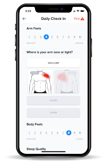 Before you start throwing, lifting, or training, the app asks for a quick Daily Check-In. This is the baseline measurement for how your arm and body feel today.