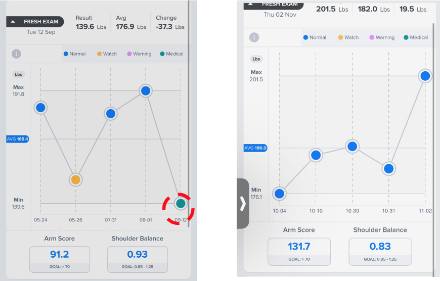 The analytics tab on the app shows trends in the hardest-throwing pitcher per pound. Notice on the left the severe strength loss of over 52 pounds after injury. Think about picking up a 52 lb dumbbell; that’s how much strength loss he experienced. On the right, his strength has skyrocketed in under two months. The focus now is on shoulder balance.