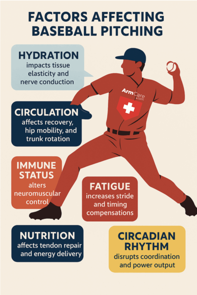 Multiple physiological systems must align to produce efficient, low-stress pitching mechanics. Travel disrupts these systems simultaneously:
