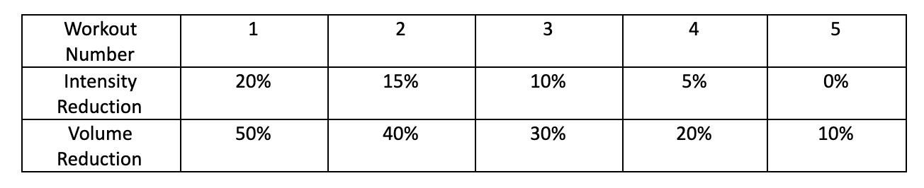 If you run an upper-lower split in the offseason it will be about a week, if you do total body training three times per week, you will adjust training for about 10 days. If you have younger athletes with very low training ages, you might have to extend this concept to 2 workouts at each designation. The trick is simple, you lower both volume and intensity together, yet when you return to ceiling training intensities at workout 5, you will see only a volume reduction of 10% prior to getting back into mainstream training. This can apply to yardage, sprint times, lifting, repetition-max-based prescriptions, and throwing.