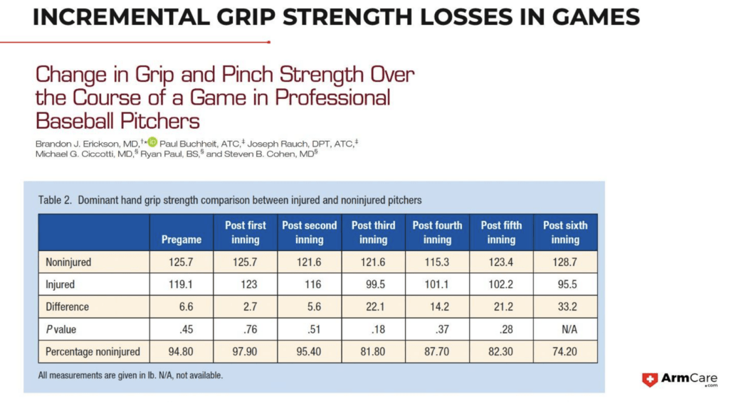 Then, in a study investigating strength losses in dynamic elbow stabilizers, full handgrip was not different between pitchers with high and low medial elbow torques and it was not sensitive to pitch counts.
