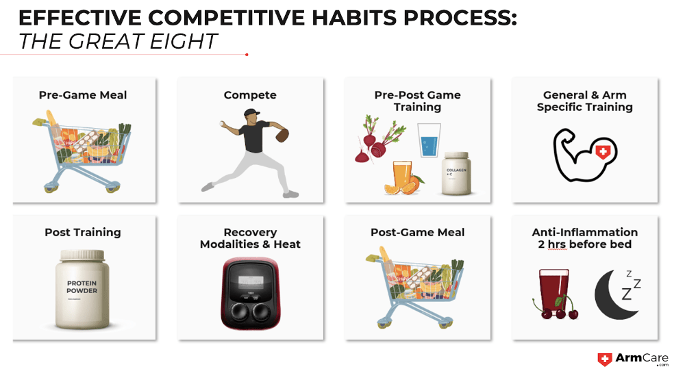 Answer: Coaches will learn evidence-based recovery protocols and strategies to help pitchers bounce back faster between outings, reducing fatigue and minimizing injury risks. This includes a systematic approach called the Great Eight Performance Process, seen here: