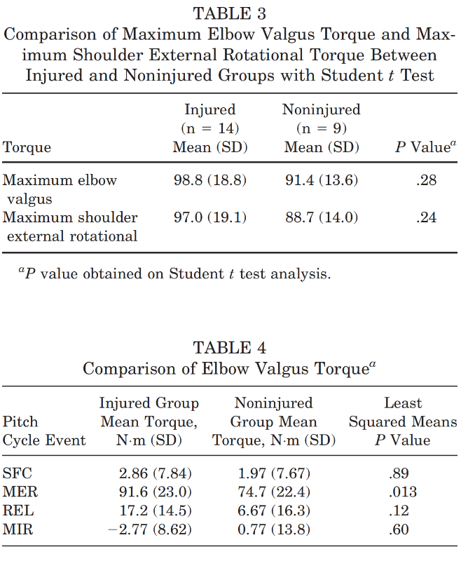 Higher elbow varus torque (a measure of medial elbow loading) seen in the injured pitchers in this study was based on a sample size of nine athletes using 2D video with hand digitization rather than the 3D technology used today.