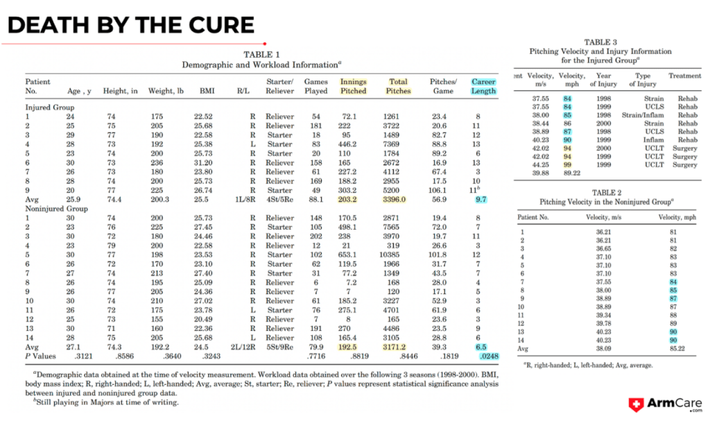Note that I highlighted in yellow that only 3 pro-injured pitchers threw above 90 mph in this study, and they were the only 3 that had surgery (that’s right, this study shows that if you throw hard, you will get injured based on 3 people).