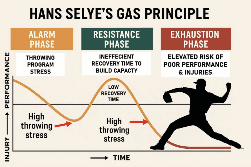 - Alarm Phase: The body perceives stress (training stimulus or throwing workload), triggering fatigue, inflammation, and decreased performance.